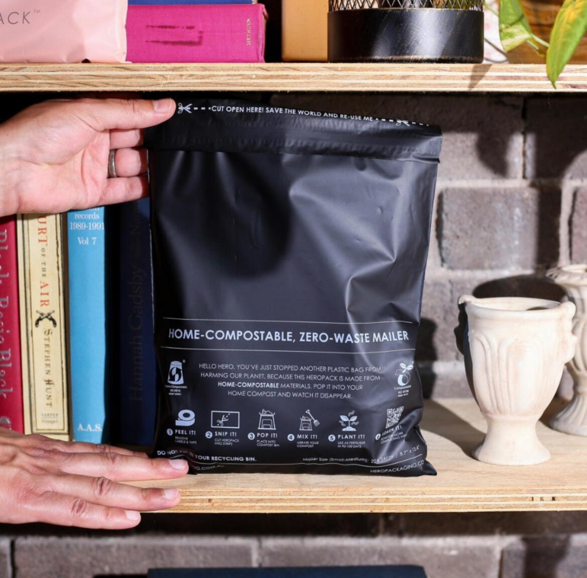 Plant-based mailing satchels designed to break down in composting environments.